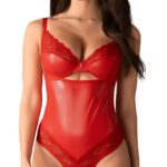 Aliosa bodysuit van Obsessive in een verleidelijke stijl. In sensueel rood met een elegante gladde glans en fijn transparant bloemenkant. Overal zacht en elastisch voor een hoog draagcomfort. Met subtiel goudkleurig sierdetail tussen de beugelcups en op één bandje. De haaksluiting in het kruis en de bandjes en haaksluiting op de rug zijn verstelbaar.